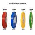 Color Weight(KG) Thickness Red 25 66mm Blue 20 53mm Yellow 15 42mm Green 10 33mm