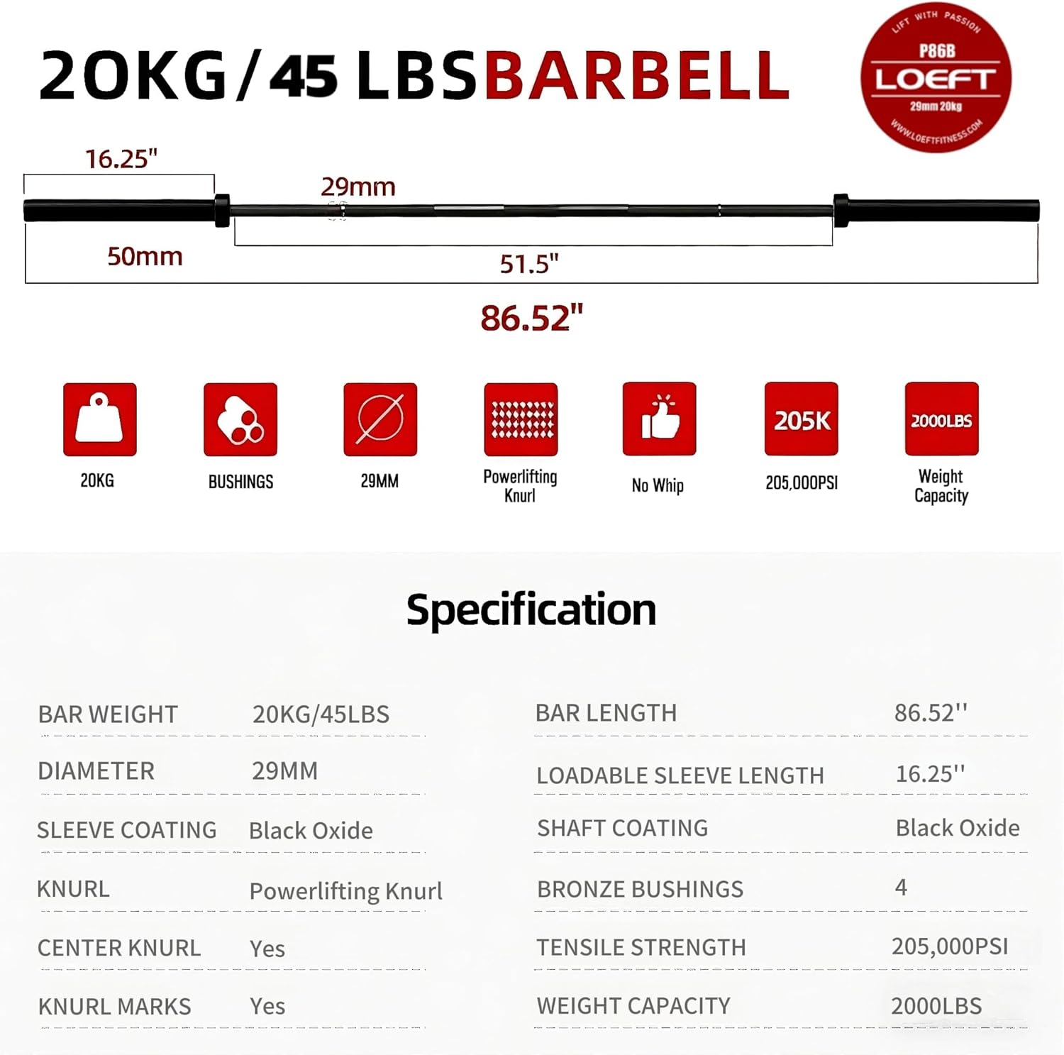 Professional Powerlifting Barbell, 7ft 20KG 29MM Olympic Powerlifting Barbell with Aggressive Knurling, 2000 lbs Capacity 205K PSI Weight Bar Fit 2" Plates for Bench, Squat, and Deadlift